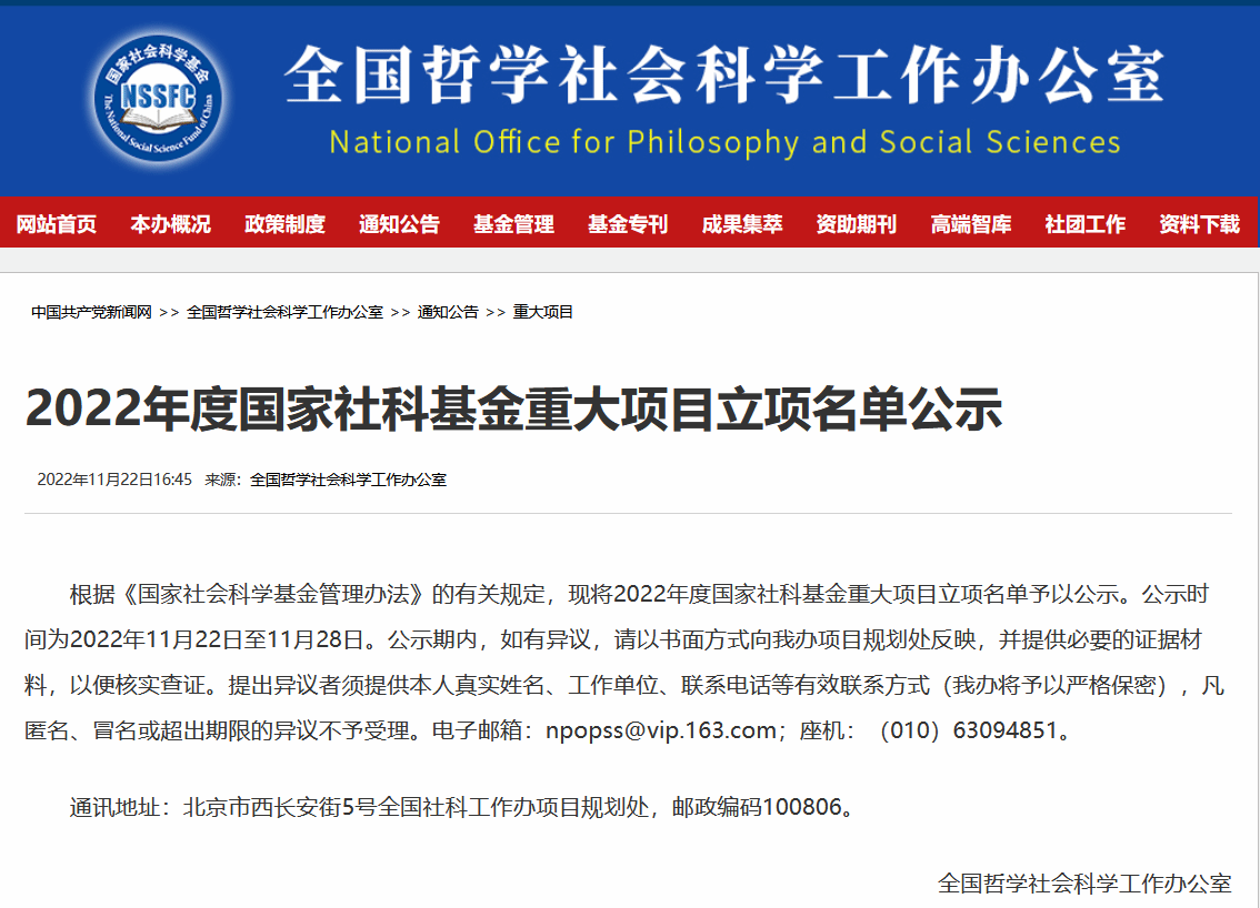 11月22日,全国哲学社会科学工作办公室网站正式公布了2022年度国家社科基金重大项目立项名单公示,我校教授黄莉领衔的科研团队投标的重大项目《中华体育精神谱系构建研究》入围。公示一个星期后,全国哲学社会科学办公室正式予以立项。