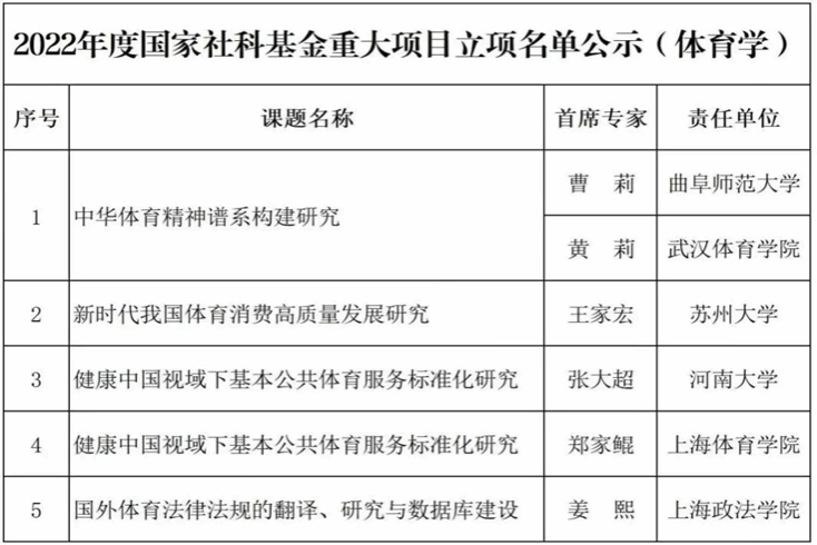 国家社科基金重大项目是现阶段我国哲学社会科学研究领域层次最高、资助力度最大、权威性最强、竞争最激烈的国家级项目,代表国内最高研究水平,是评价高校科研能力的重要指标,持续受到社会的高度关注。今年,全国该项目立项课题总数为340项,其中体育类重大项目有5项立项,我校黄莉教授领衔的科研团队拿到了其中的1项。