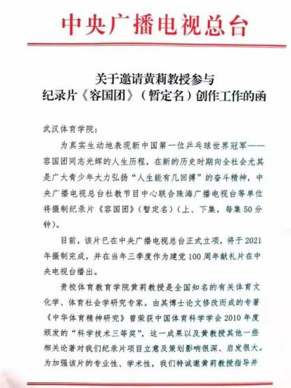 为了保证纪录片的专业性和学术性,央视导演组在制作之初就在全国寻找对体育精神、中华体育精神有研究成果和独特见解的体育界专家,最终我院黄莉教授的研究成果被选中,被央视导演组邀请加入核心主创团队,参与此纪录片从策划、设计到制作的全过程。