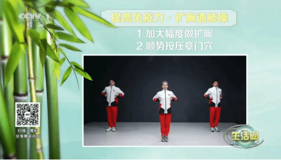 中央广播电视总台综合频道CCTV-1《生活圈》以“健康生活每一天”为栏目定位,以“大健康”为主打题材,引领中国老百姓的健康生活。每周一至周五,CCTV-1早间8:38—9:20播出,时长42分钟,在新媒体平台同步分发。内容涵盖疾病预防、安全用药、养生保健、科学膳食、运动健身等。该节目运动版块“提高免疫力 全民健身操”播出时间约在9:05左右。2023年12月1日-3日,在中央广播电视总台综合频道陈贝洁导演及其团队的精心策划、准备和指导下,顺利、高效完成了这套健康操的教学指导拍摄工作。参与拍摄任务的还有国家体育总局体育科学研究所研究员刘新华(生活圈运动专家团成员)、首都体育学院体操师生。