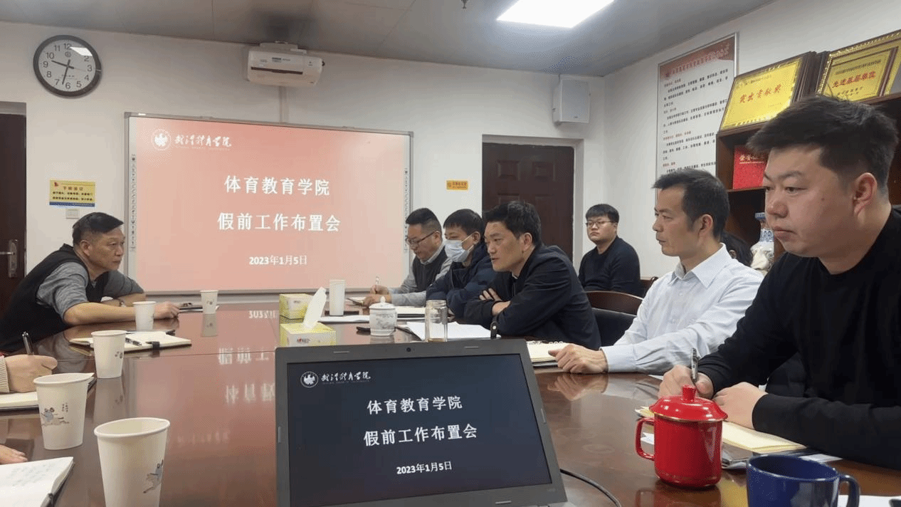 新闻网讯(通讯员 吴慰)1月5日上午,体育教育学院在学院会议室召开寒假假前工作布置会,回顾2023年整体工作,部署2024年重点工作。学院领导班子,教研室书记、主任,全体辅导员员参加会议。会议由院长彭小伟主持。