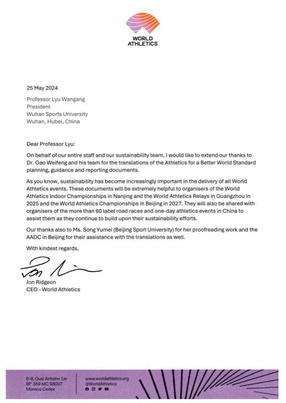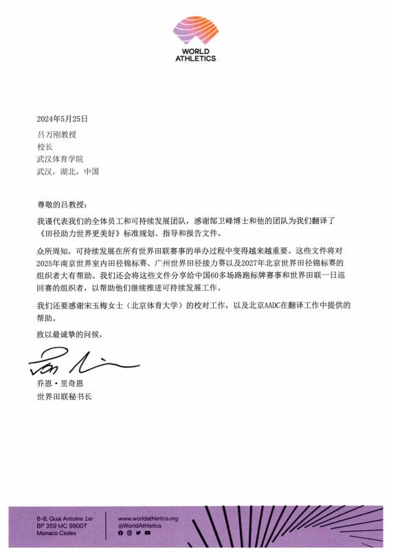 新闻网讯(通讯员 吴慰)2024年5月25日,世界田联秘书长乔恩·里奇恩向我校发来感谢信,感谢体育教育学院教师郜卫峰及其团队的翻译工作。郜卫峰带领团队于2024年3月29日至2024年4月24日,志愿为世界田联翻译《田径助力世界更美好》标准规划、指导和报告等文件共13份,近4万词。这些文件将用于2025年南京世界室内田径锦标赛、广州世界田径接力赛、2027年北京世界田径锦标赛及中国60多场路跑标牌赛事和世界田联一日巡回赛的组织。