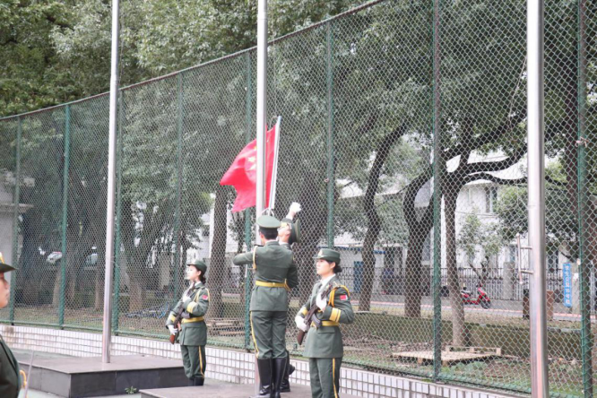 随后,升旗仪式正式开始。 学校国旗护卫队的成员们斗志昂扬,迎着秋风,迈着矫健的步伐走向升旗台。