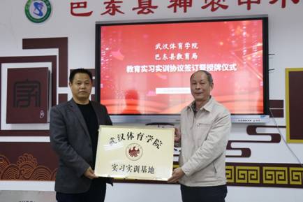 20日上午,教育实习实训协议签订授牌仪式在巴东县神农中小学举行。巴东县教育局副局长谭明生、扶贫办主任胡泽树、神农中小学校长谭东升、武汉体育学院实习生以及神农中小学部分教师代表参加了授牌仪式。