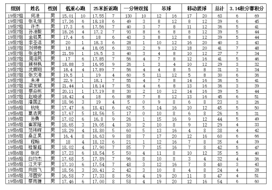 乒羽教研室根据比赛内容制定竞赛规程,以周为单位,组织全体羽毛球专选生进行职业技能、专项体能测试,对测试分数实行累计积分制。现公布第一周各专选班测试成绩。