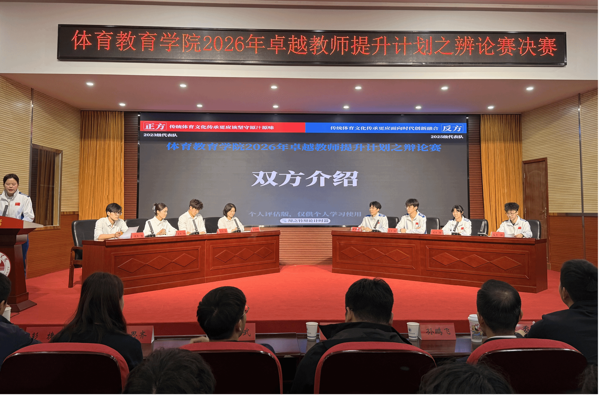 比赛围绕“传统体育文化传承更应该坚守原汁原味还是面向时代创新融合”展开辩论,双方辩手逻辑清晰、妙语连珠,充分展现了武体学子的思辨风采与专业素养。经过激烈角逐,2023级代表队凭借扎实的论证与默契的配合斩获本次比赛冠军。