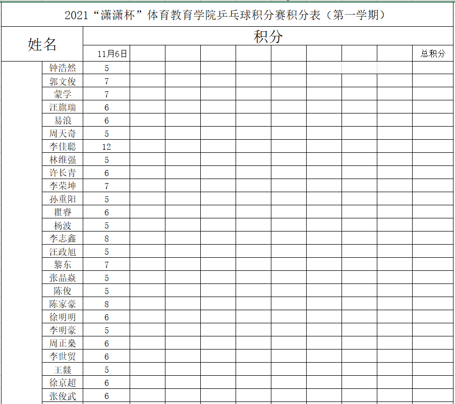 新闻网讯(通讯员沈磊)11月6日上午九点半,武汉体育学院体育教育学院乒乓球积分排名赛(竞赛)在小球馆成功举办。