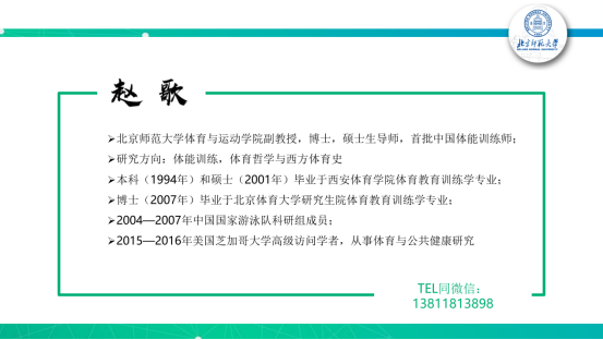 赵歌,北京师范大学体育与运动学院副教授,博士,硕士生导师,首批中国体能训练师。研究方向为体能训练,体育哲学与西方体育史。本科(1994年)和硕士(2001年)毕业于西安体育学院体育教育训练学专业;博士(2007年)毕业于北京体育大学研究生院体育教育训练学专业;2005—2007年中国国家游泳队科研组成员;2015—2016年美国芝加哥大学高级访问学者从事体育与公共健康研究。